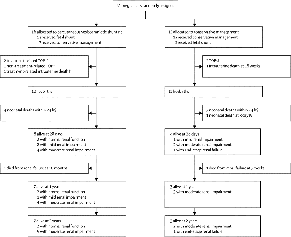 So what did they find in the trial? Seven of the 16 babies randomized to be shunted survived to one year of age; and 3 of the 15 randomized to be treated conservatively, with evaluation and treatment after birth, survived.