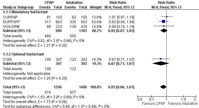 When I divide the analyses into those studies that mandated surfactant for all the infants, to those that had optional surfactant therapy (that is the COIN study, where the large majority did get surfactant) the overall result is the same, a very nearly significant reduction, even when including the VON-DRM CPAP babies only once.