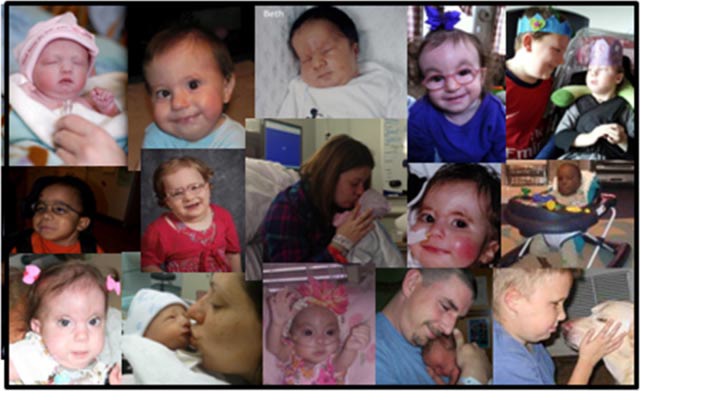 Family pictures of children. From top left to right: Gianna, full T18 (died 1 week), Nolan, full T18 (died 2 years), Beth, full T13 (died 3 months), Guiliana, mosaic T18 (2 years), Emma, full T18 (died 5 years), Joey, full T13 (5 years), Sofia, full T13 (6 years), Allison, full T13 (died 1 day), Annie, full T18 (died 12 years), John, full T13 (died 1 year), Caitlyn (3 tri 18), Cathal, full T18 (died 1 day), Sophee, full T18 (died 6 months), Bristol, full T18 (died 2 months), Devon, full T13 (17 years).