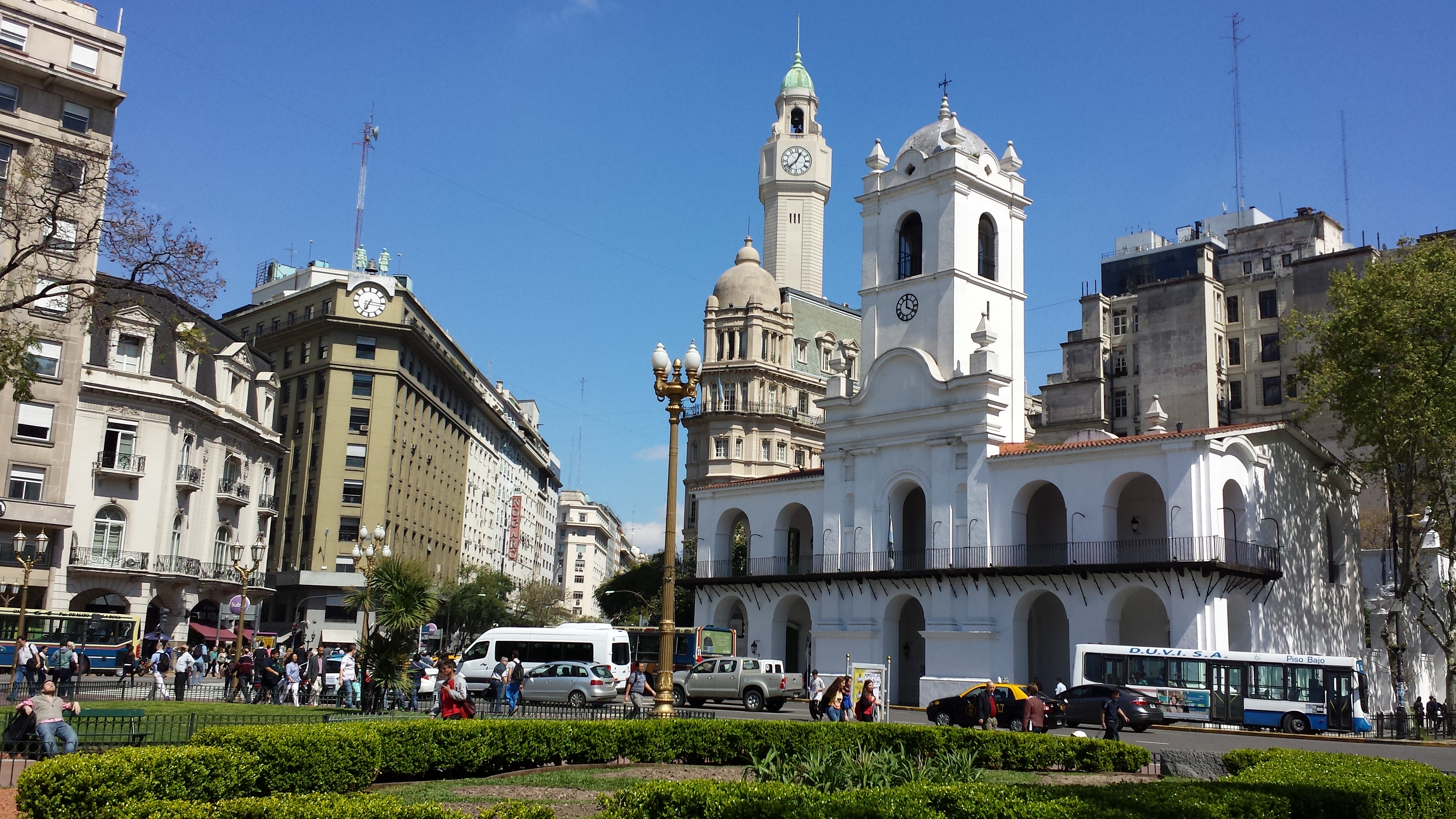 On my way home from a great, but too short, trip to Buenos Aires. Spoke at a conference there. I had an afternoon off and was able to take a long walking tour, including taking the Avenida de Mayo. Where I took this picture of one view from the Plaza de Mayo, where there are many political demonstrations, including an on-going display by the veterans of the Malvinas War It shows some examples of the varied architecture of the city. See if you can tell what time it was when I took the photo.
