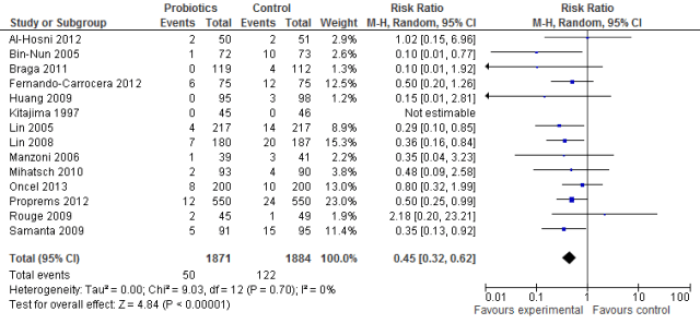 As you can see the effect on NEC is significant p<0.00001, with little heterogeneity, and a relative risk of 0.45.