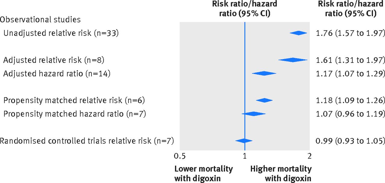 As you can see observational studies show increased mortality with digoxin, in adjusted analyses there is less harm, in propensity matched analyses less harm again, and in RCTs no harm was shown.