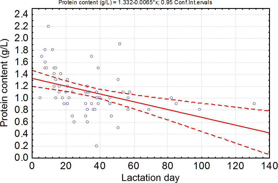 Protein concentration of milk expressed by mothers of preterm infants during the lactation period. We included 70 milk samples expressed by mothers of preterm infant between the 5th and the 131st day of lactation in the analysis.