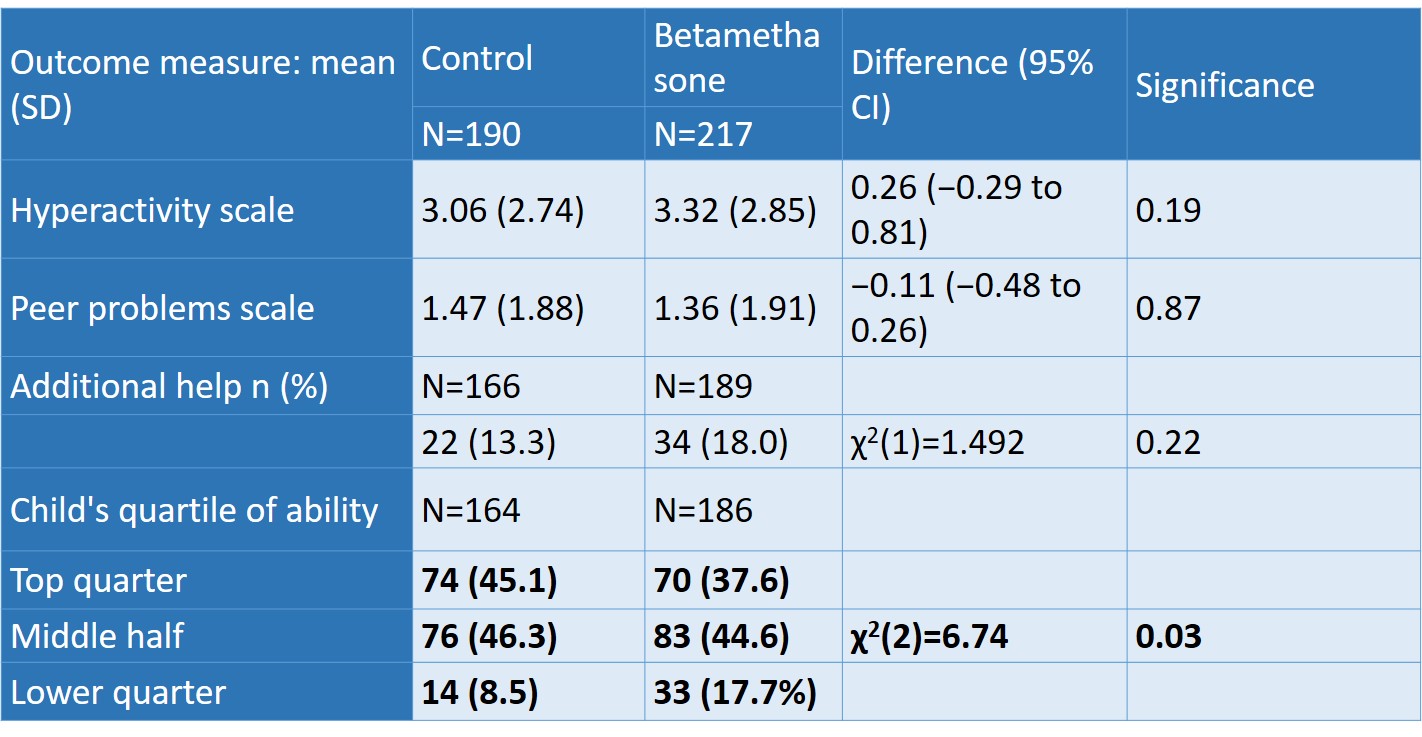 For the educational outcomes they are presented in an extremely limited way, and the sentence in the abstract states that the proportion of children achieving a certain level of competence on the standardized tests was similar between groups but they never actually tell you that in the publication, but present a different and more worrying result instead showing a shift downwards in the steroid-exposed children’s academic ability compared to controls.