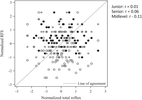 Absolutely no correlation between the scores, the RFS, and any measure of reflux that they examined. Also there was almost no agreement between ENT surgeons. They tried really hard, by creating new pediatric subscores of the RFS, and still couldn’t find anything. No correlation between the entire score or any subset of the score and number of reflux events, percentage of time with reflux, acid reflux alone or anything. In fact, with all the correlations that they looked at they risked finding something by chance alone, but they didn’t.