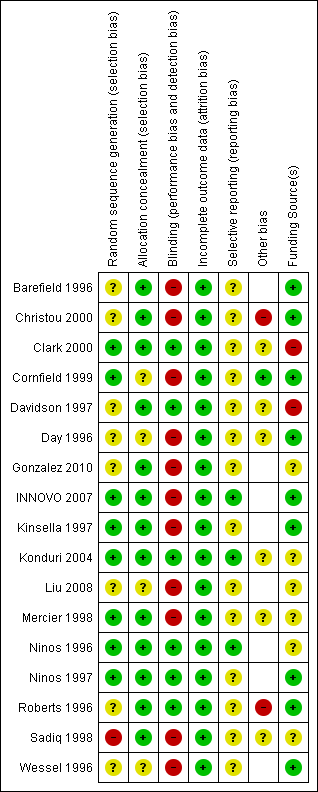 For several of the trials the funding source was not clear, hence the question mark, but for several which are marked by the question mark in yellow, including for example Konduri 2004, funding was primarily from a government granting agency, but there was also partial support from industry, with the manufacturer of inhaled NO providing the gas (and placebo) free of charge for the trial.