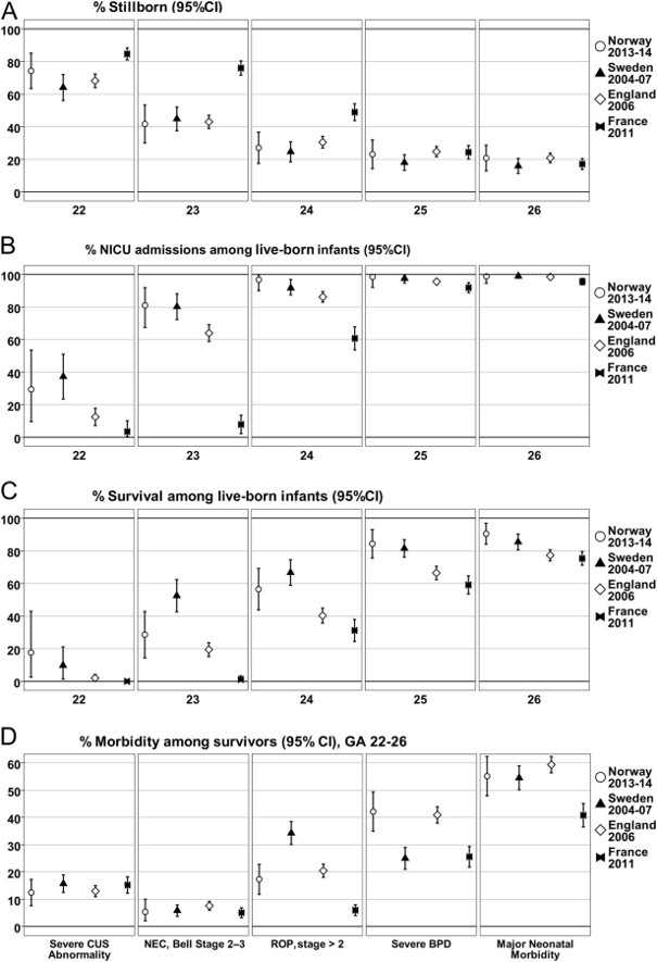 The authors then compare their data to recent European publications of national cohorts of extremely preterm infants. As you can see the percentage of babies admitted to intensive care was similar in Norway and Sweden, lower in the UK at 22 and 23 weeks, and a little lower at 24 weeks, and very different in France, with almost no admissions at 22 or 23 weeks, and many fewer at 24 weeks gestation. As for survival, despite a similar proportion receiving intensive care, babies in Sweden were more likely to survive at 23 and 24 weeks, than the Norwegian babies. In the UK the survival was almost non-existent at 22 weeks and much lower at 23 weeks, and the French babies never survive before 24 weeks, and even at 24 and 25 weeks survival is lower.