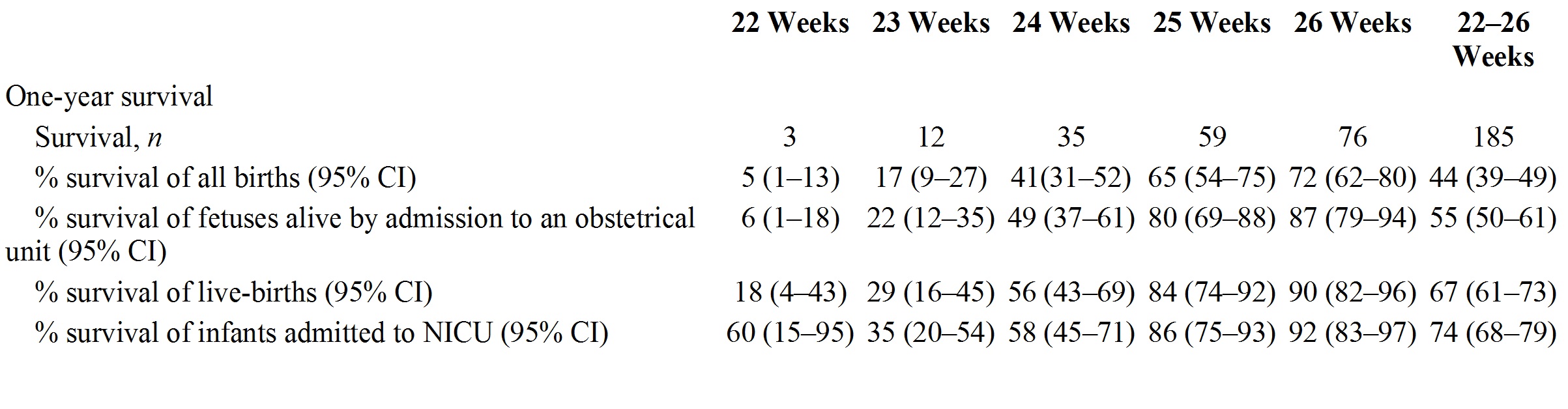 What is quite obvious is that survival is very different depending on which denominator is used, these data are a very clear example of that; changing from 5% among all births to 60% among those admitted to NICU at 22 weeks gestation (60% being 3 of the 5 babies actively treated).