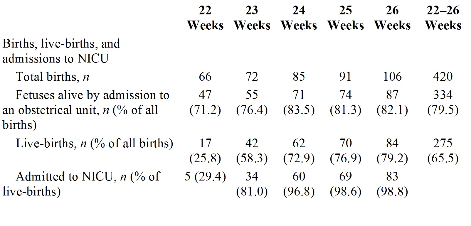 A great thing about this article is that the numbers of fetuses/babies alive at each point are detailed in the first table, of the 420 babies delivered. 335 were alive when the mother was admitted to hospital, 145 were stillborn, leaving 275 who were liveborn, and 251 admitted to a neonatal unit.