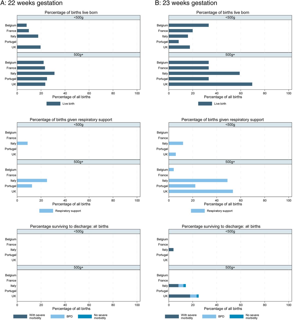 At 23 weeks and over 500 grams there were no babies receiving intensive care in the French regions, 1 in the Belgian region, 1 in the Portuguese region, 24 in the Italian cohort and 30 in the UK. The only survivors were in Italy and the UK with 7 and 14 survivors respectively.