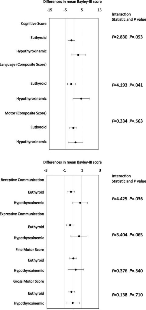 These figures show the mean differences between iodide supplemented and control infants for the various domains of the Bayley Scales. The hypothyroid babies who received iodide have slightly higher scores than controls on the cognitive and language scales. The euthyroid babies in contrast had very slightly lower scores.