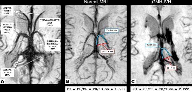 You can see some of these interesting images below, they show an image A with the veins labelled, and image B with an angle measured which is called the curvature index, and an illustration in image C one of the two main findings of the study, that babies who had an intraventricular or germinal matrix hemorrhage had an increased curvature of the vein draining into the internal cerebral veins, which is either the thalamostriate vein (the classical pattern) or the direct lateral vein (a fairly common variant).