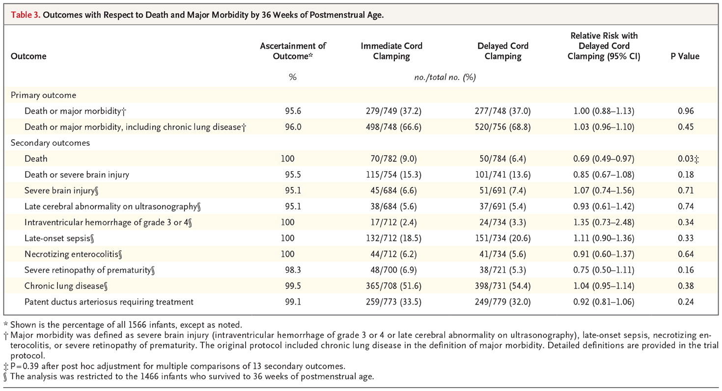 It would be interesting to have a “per-protocol” analysis of mortality results, which I would guess would show a greater difference between groups, as babies who had the delayed clamping interrupted because of concerns about neonatal status might well have a higher mortality. There is an analysis of the per-protocol effects on the primary outcome (in the supplementary appendix) which shows a difference (which may just be due to chance, p=0.2) : 37% with immediate clamping, and 33% with delayed clamping, but no mention of the components of that outcome.