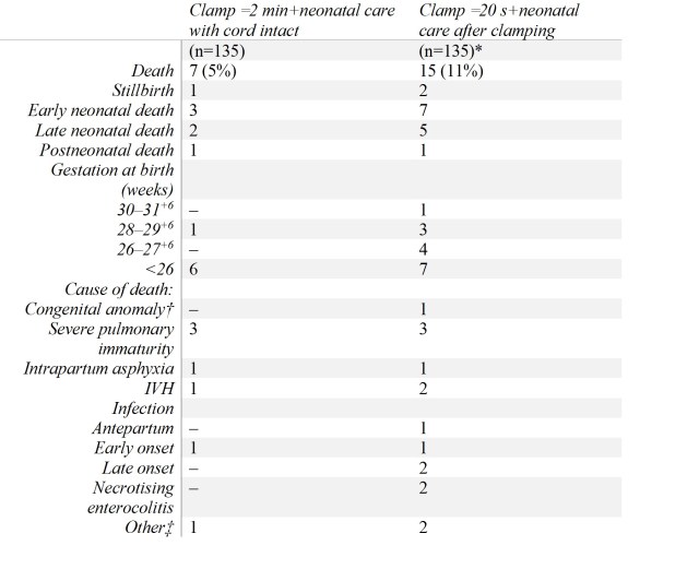 There were fewer deaths with delayed clamping, although they had relatively lower power, and the results may have been due to chance, 15/135 died with early clamping, 7/135 died in the group randomized to delayed clamping, Relative Risk 0.47 (95% Confidence Intervals 0.20 to 1.11). As with the APTS trial, causes of death were quite varied, and the gestational ages of the babies who died included some relatively mature babies.