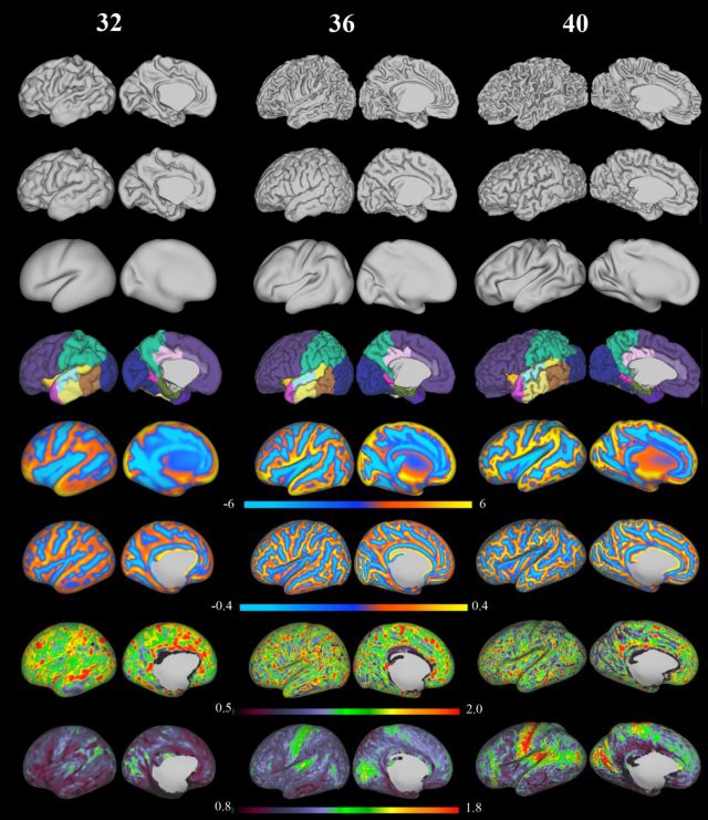 These are 3-D reconstructions of the cortical surface of newborn brains, with the images showing the surface of the white matter at the top, of the grey matter next, followed by the inflated surface (whatever that means) different structures, sulcal depth maps, brain curvature, cortical thickness and T1/T2 myelin maps. You can see the progression of complexity and maturation of the brain in the last 8 weeks of pregnancy.