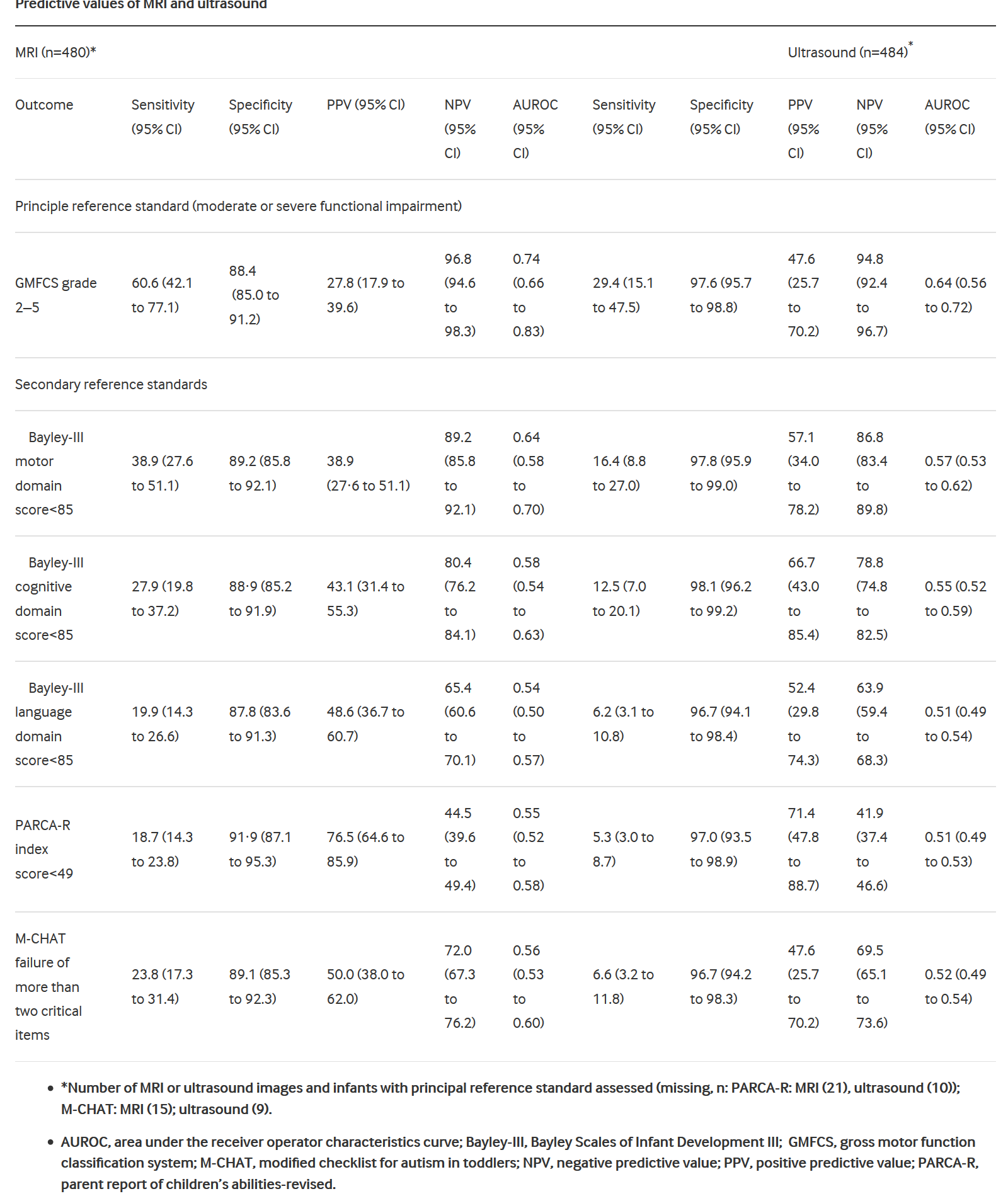 The authors of this article calculate the area under the receiver operator characteristics curves, which were modestly higher for MRI than for US for prediction of moderate or severe motor dysfunction (0.74 compared to 0.64) and for motor dysfunction, but were very similar for cognitive and language dysfunction.