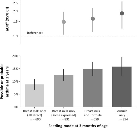 I think based on this we can say 2 things, encouraging breast-feeding, and making it feasible for new mothers to have several months of leave to breast feed their babies is important (USA, I am talking to you!) There may be an increase in asthma prevalence with mixed breast-feeding and expressed breast milk feeding, this may be due to unknown confounders, but, if causative, it is likely to affect those with the largest proportion of their feeds as expressed milk, however feeding some expressed breast milk which is still preferable to formula feeding.