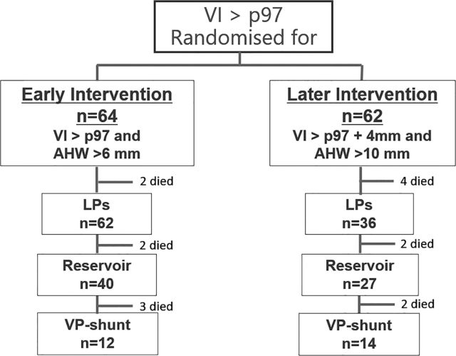 In the late intervention group the same approach was taken, but starting when the ventricular index was more than 4mm above the 97th percentile.