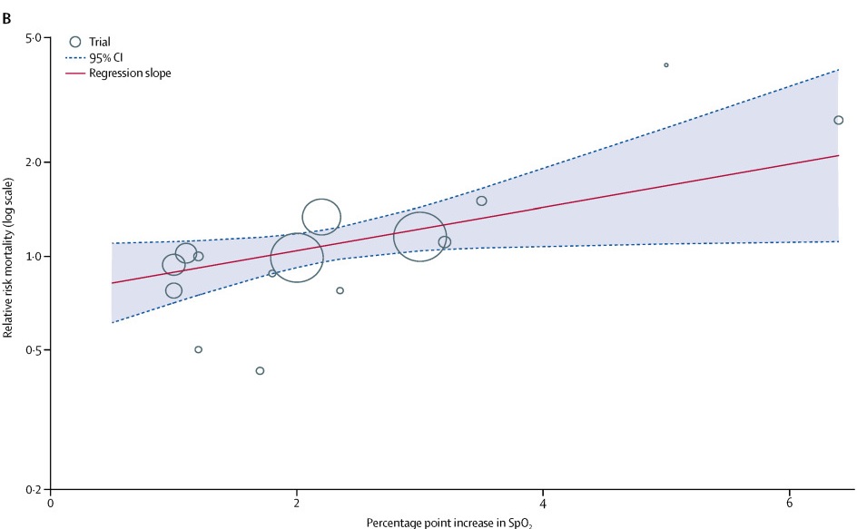 Another interesting finding from this review is that there seemed to be a dose effect, as saturations increased there was a greater effect on mortality, and the impact seemed to be significant above a saturation of about 94 to 96%.