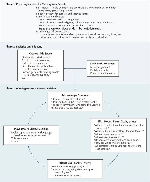 He notes that discussions about redirecting active intensive care to comfort care often incorporate a formal request to write a DNR order, but that we do not request a “Do Not Dialyze” order or a “Do Not ECMO” order. That our discussions should incorporate more listening, and more attempts to understand the values and preferences of the family, “to respect those values and honor those preferences, doctors need to listen carefully to understand what parents are saying, what they are not saying, what they mean, and what they need. Sometimes they may be saying that there are things that they prefer not to discuss or decisions that they prefer not to affirm”.