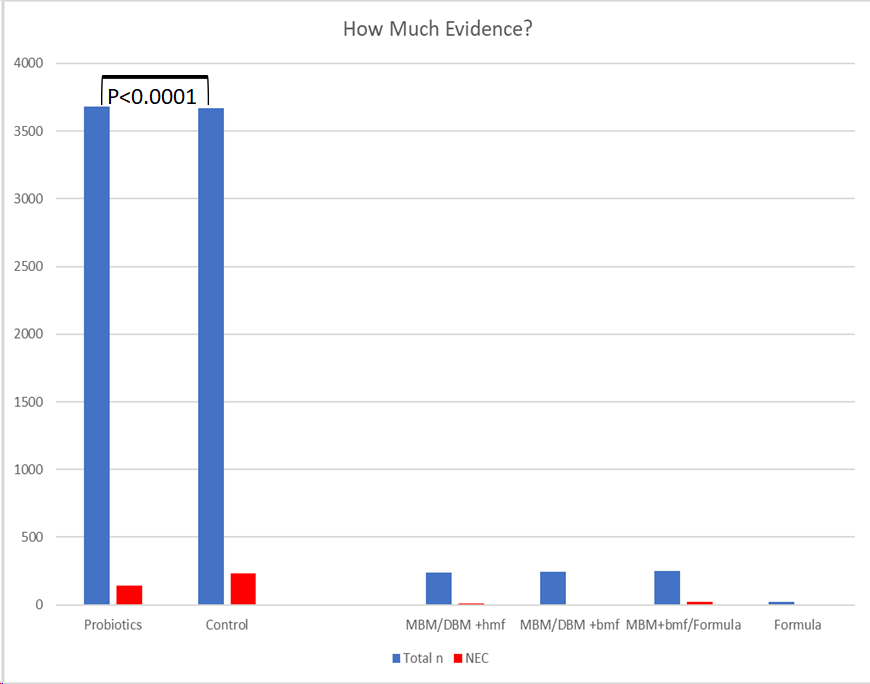 I think it is interesting to compare the tiny amount of information we have about different sources of fortifiers and milks for their impact on NEC, to the evidence which exists from RCTs of probiotics. The latest systematic review/meta-analysis included about 3,600 patients per group.