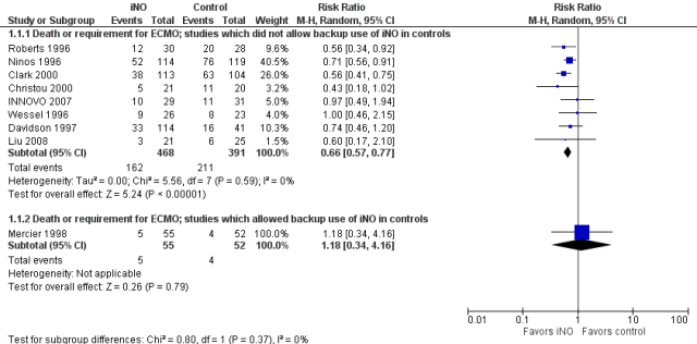 In general, to be confident about the impact of an intervention, it is preferable to see at least one very large trial with narrow confidence intervals including babies from multiple centers. The alternative being several trials with different risks in the controls and similar relative risk reductions in order to conclude that something which appears effective in a very high risk population is also effective in a lower risk population. That is the kind of information that we have for inhaled nitric oxide in term infants, for example. Here is the Forest plot for the iNO studies, as you can see, the larger studies had relative risks of “death or ECMO” between 0.56 and 0.74, and the confidence intervals all overlap substantially, despite differing control group risks.