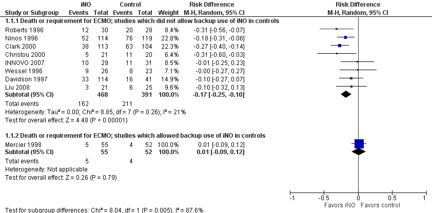 In general, to be confident about the impact of an intervention, it is preferable to see at least one very large trial with narrow confidence intervals including babies from multiple centers. The alternative being several trials with different risks in the controls and similar relative risk reductions in order to conclude that something which appears effective in a very high risk population is also effective in a lower risk population. That is the kind of information that we have for inhaled nitric oxide in term infants, for example. Here is the Forest plot for the iNO studies, as you can see, the larger studies had relative risks of “death or ECMO” between 0.56 and 0.74, and the confidence intervals all overlap substantially, despite differing control group risks.