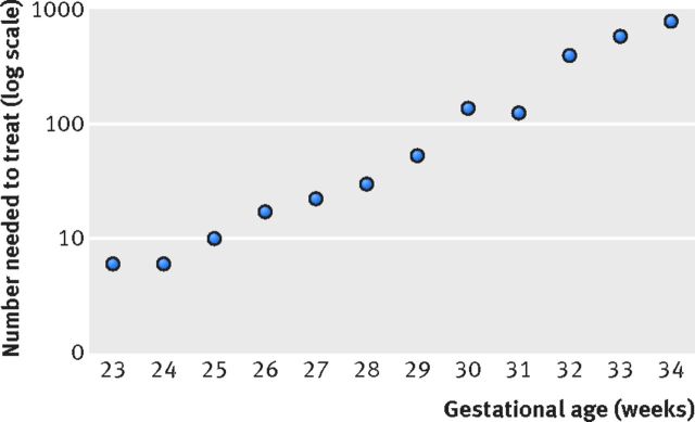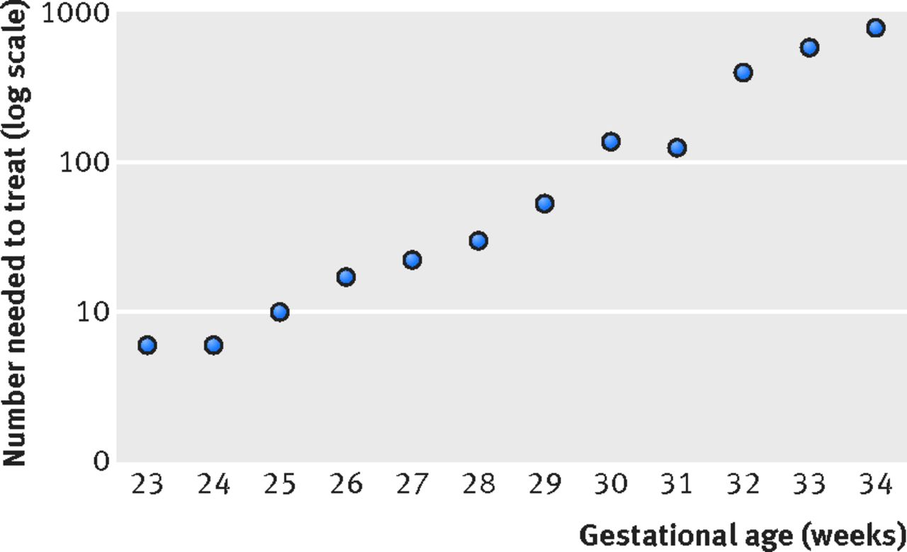 At 23 weeks you only need to give 8 courses of steroids per extra survivor, compared to almost 1000 at 34 weeks! That study collected no data at 22 weeks gestation, but I can’t see any reason why the curve, which seems to flatten off a bit at the bottom, would suddenly leap upwards again.