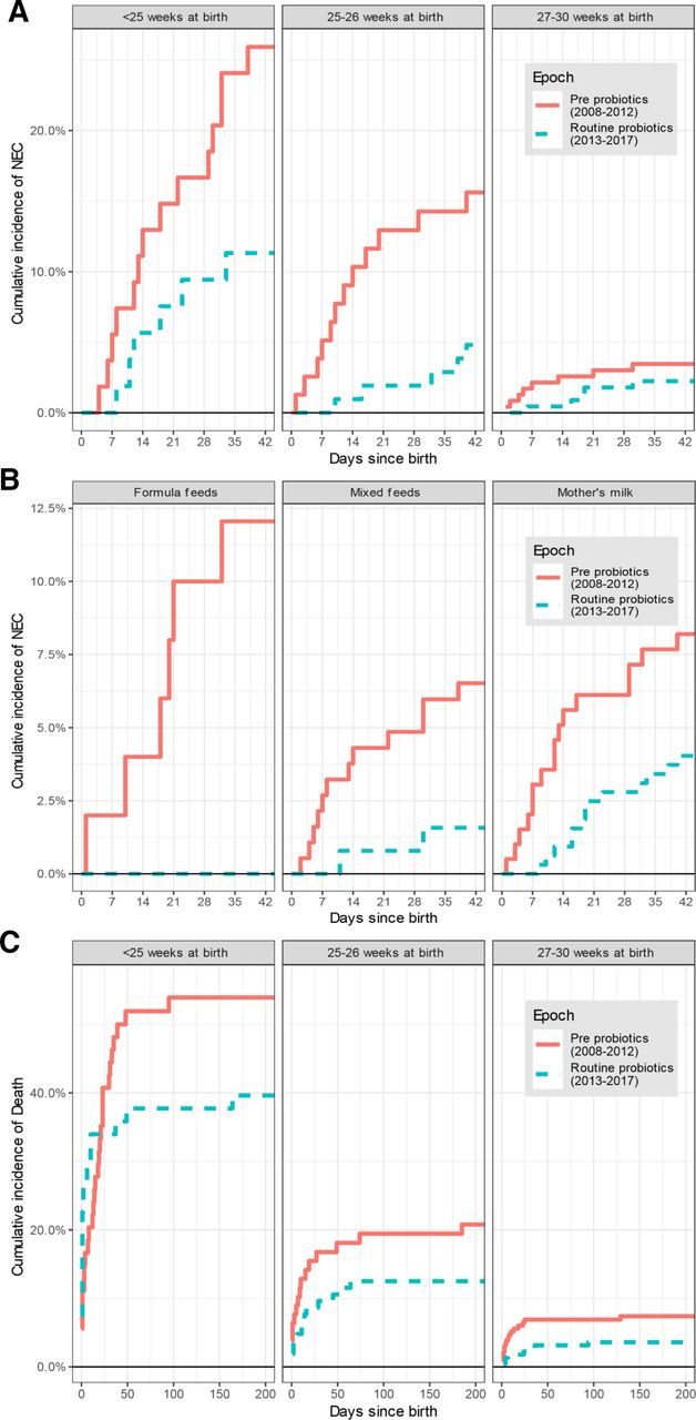 A newly published cohort study from Norwich shows that there are some UK centres that have nevertheless introduced routine probiotic supplementation (Robertson C, et al. Incidence of necrotising enterocolitis before and after introducing routine prophylactic Lactobacillus and Bifidobacterium probiotics. Arch Dis Child Fetal Neonatal Ed. 2019:fetalneonatal-2019-317346). In 2013 they introduced probiotic prophylaxis, and they have seen an immediate and persistent reduction in NEC, using, at first, a preparation with 2 organisms, and more recently a preparation with 3 organisms, including a B longum sbsp infantis. They found more than a 50% fall in NEC after introducing probiotics, a decrease which was sustained, and did not seem to be associated with any other changes in practice. Breastfeeding frequency was stable, and they performed multiple analysis to try and confirm whether or not the probiotics were likely to be the main change associated with NEC reduction, no other obvious explanation was found. They evaluated the effects in multiple subgroups.