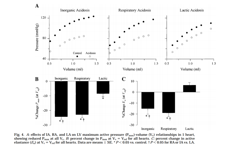 Here is one example, using an isolated perfused adult rabbit heart, with a pH of 7.4 for the controls and pH=7.03 for each of the 3 models of acidosis. (Berger DS, et al. Disparate effects of three types of extracellular acidosis on left ventricular function. Am J Physiol. 1999;276(2):H582-94). As you can see respiratory acidosis had impacts similar to the HCl, leading to a 22% reduction in maximal pressure generation, whereas lactic acidosis only reduced pressure generation by about 8%. Elastance of the ventricle (the inverse of compliance) was not affected by lactic acidosis.