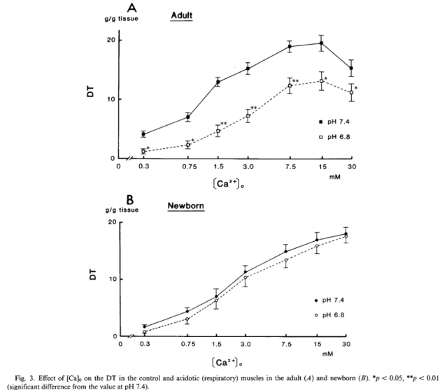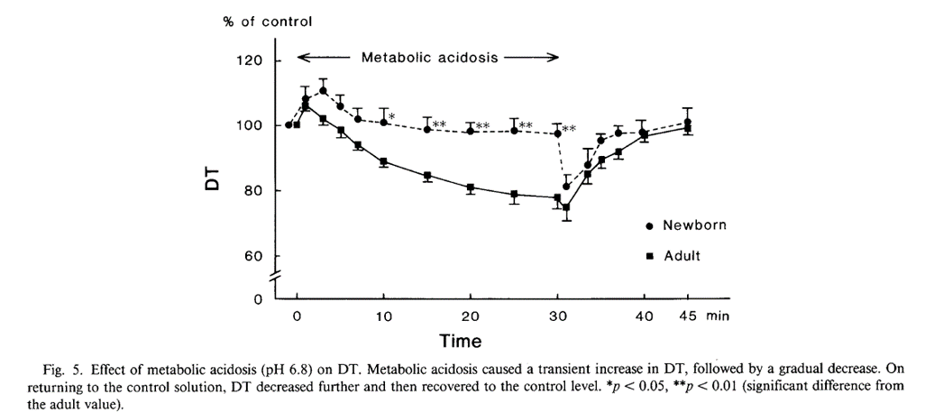 This figure, as one example, (Nakanishi T, et al. Effect of acidosis on contractile function in the newborn rabbit heart. Pediatr Res. 1985;19(5):482-8) shows the impact of respiratory acidosis pH=6.8 on the calcium tension relationship in rat hearts, compared ot the adult. There is almost no detectable impact of a very low pH in the newborn.
