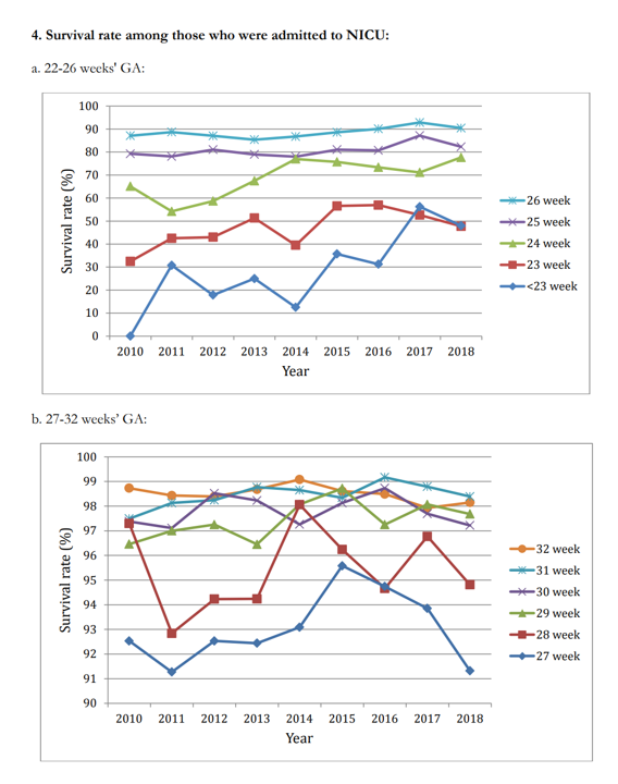Any reasonable human eye would surely behold a 60 to 70% survival, with encouraging long term outcomes, as a good thing. Other networks are also seeing progressive improvements in the survival of infants born at 23 weeks or less (the Canadian Neonatal Network for example) look at the figure below (from the 2018 annual report) for the survival among actively treated infants at 23 weeks and <23 weeks. Only 30% of babies under 23 weeks received active treatment, and there wasn’t much change in that over these years, but among babies born at 23 weeks the proportion receiving active treatment increased from about 60% to 70-80% over this period.