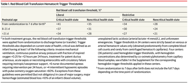 Hence the need for more trials. At least 2 large multicentre RCTs have been performed, and the first to be reported is ETTNO (Franz AR, et al. Effects of Liberal vs Restrictive Transfusion Thresholds on Survival and Neurocognitive Outcomes in Extremely Low-Birth-Weight Infants: The ETTNO Randomized Clinical Trial. JAMA 2020;324(6):560-70). In this trial 1,000 babies < 1kg birthweight were randomized at less than 72 hours of age to receive transfusions when their hematocrit fell below either higher or a lower threshold. The thresholds were adjusted by postnatal age and whether the babies were “critically ill” or not. The schedule is here, and I am also including the notes, which describe the criteria for being “critically ill”.
