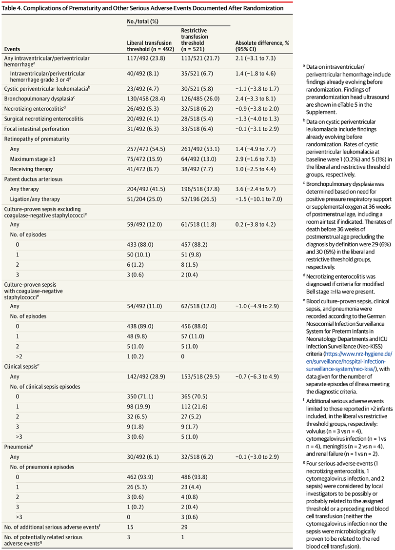 The only other sizable RCT in the literature, until now, enrolled 100 babies < 1300g birthweight, and again showed very little impact (Bell EF, et al. Randomized trial of liberal versus restrictive guidelines for red blood cell transfusion in preterm infants. Pediatrics. 2005;115(6):1685-91). That study was reported as showing a possible increase in the combined outcome of grade 4 IVH and PVL with restricted transfusion guidelines, but if you look at the results grade 3 haemorrhages were much more frequent in their liberal transfusion group (16% vs 2%) and if you examine all the significant brain injury together, there was no difference between groups.