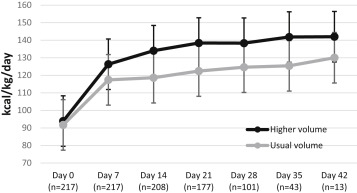 The average calorie density at study termination was 23 kcal/oz in each group (ranging from 20 to 30 kcal/oz), so they could possibly have achieved as good growth in the lower volume group by increasing calorie density. The feed tolerance was excellent in both groups and was not more of a problem in the higher volume group. There were no cases of Necrotizing Enterocolitis.