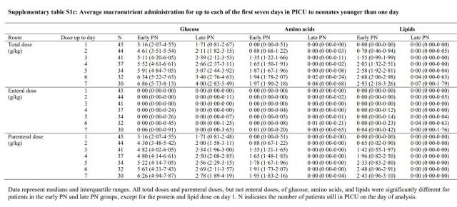 The newborn subgroup was more likely to have at least one blood sugar <2.2 mM/L in the late PN group. As you can see from the supplementary tables (well you can’t actually because you have to pay for them also so I’ll copy one example here) the late PN group had much lower intakes of sugar, protein and fat during the 1st week, the 1-day olds were almost all nil by mouth, it seems, as their enteral nutritional intakes averaged 0.