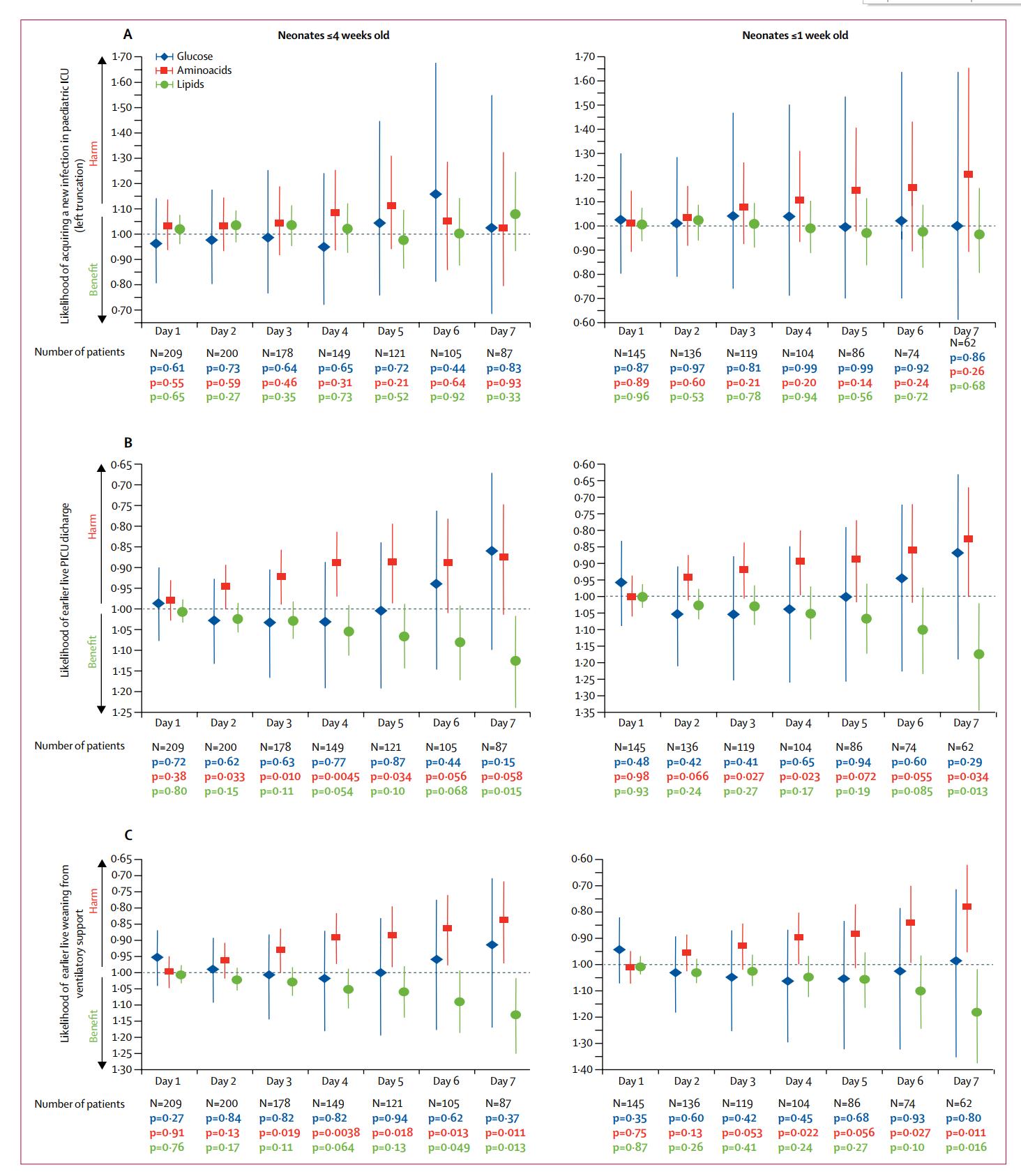 I think it would be a mistake to assume that this means that lipids and glucose were beneficial. The babies on early PN almost all received both amino acids and lipids, and it is only by this data dredging, which might be suggestive but is certainly not conclusive, that the potential relatively different impacts of different components of the PN can be seen.