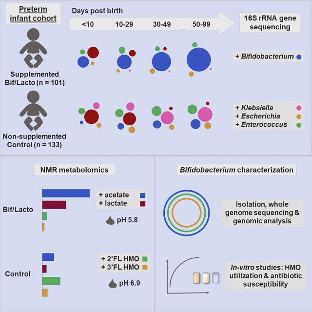 They showed evidence from the metabolomic analysis that the supplemented kids had gut flora that were actually doing their job and metabolizing HMOs to acetate and lactate, leading to a lower stool pH. They also confirmed the adverse effects of antibiotics on intestinal microbiome composition, and that the more immature infants had more difficulty developing a Bifidobacteria preponderant microbiome.