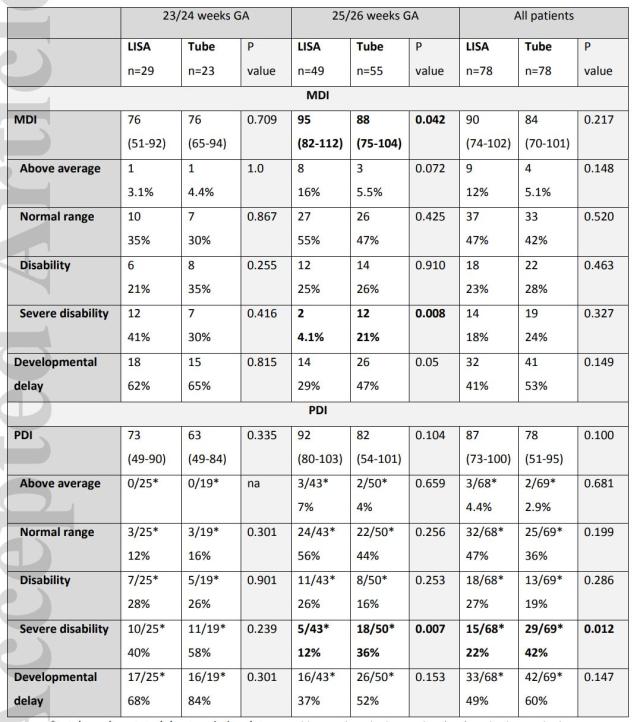 Disability was defined if the mental development index (MDI) or psychomotor development index (PDI) was <85 but ≥70, severe disability was defined for MDIs or PDIs <70. Indices between 85 and 115 indicated normal development, indices >115 were defined as development above average. Developmental delay referred to any MDI or PDI <85.