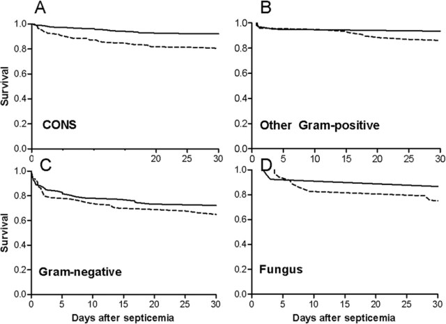 Organism-specific mortality based on heart rate characteristics (HRC) monitor display… Survival was higher in each organism group in infants with HRC displayed (solid line) compared with those with HRC not displayed (dashed line).