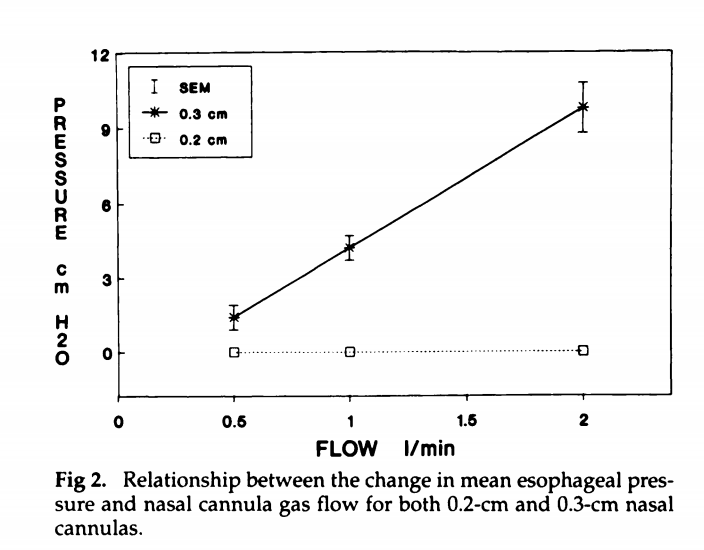 When heated, humidified, high flow nasal cannulae were first being spoken about I remembered an old study using standard cannulae but with flow rates up to 2 litres per minute. In 13 infants with an average body weight of about 1500g, the authors measured intra-oesophageal pressures, using either 0.2 or 0.3 cm diameter prongs. (Locke RG, et al. Inadvertent administration of positive end-distending pressure during nasal cannula flow. Pediatrics. 1993;91(1):135-8).