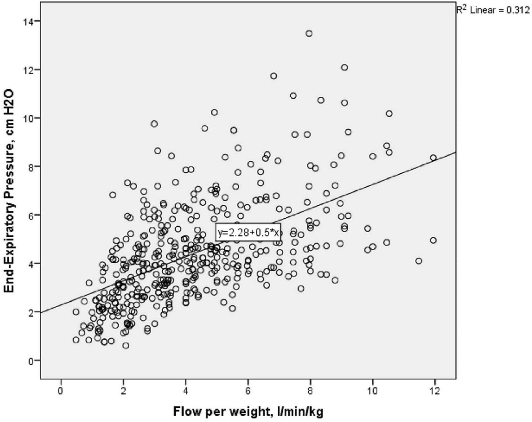 A flow of 8 lpm/kg produced pressures between 2 and 14 cmH2O, at 2 lpm/kg pressures were between close to 0 and 7 cmH2O.