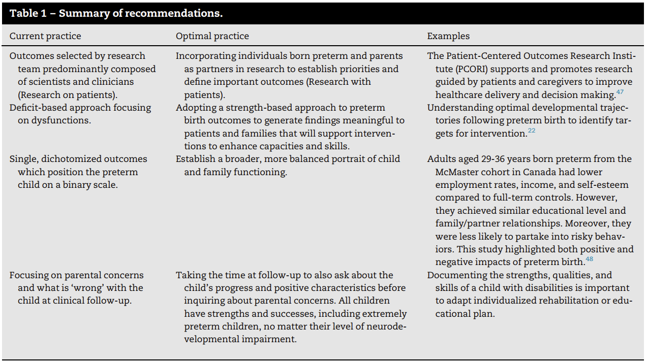 To follow on from my previous post, there is also an article from Thuy Mai-Luu who runs our follow-up program at Sainte Justine, and Rebecca Pearce, an ex-NICU parent. They discuss how to improve neonatal follow-up to make it more relevant to parents, they include the following table: