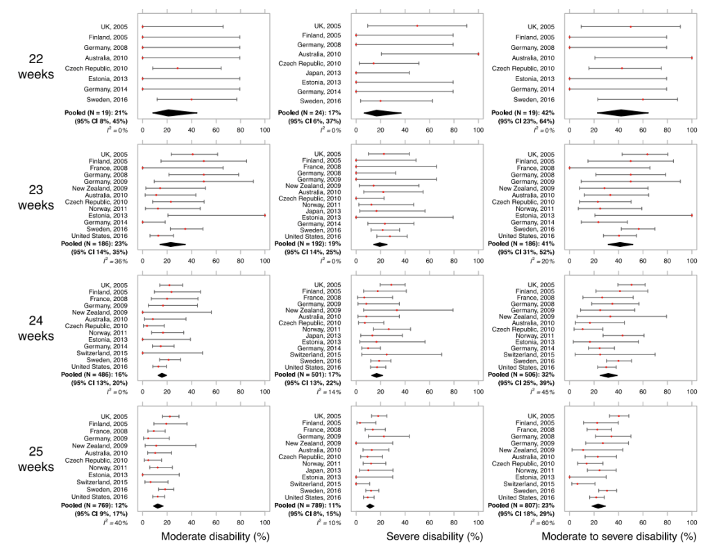 The belief that there is a dramatic reduction in the proportion of survivors with an “acceptable quality of life” as GA gets lower is a common prejudice that is not based on any data. As you can see from this graphic from a systematic review of long term outcome studies (Ding S, et al. A meta-analysis of neurodevelopmental outcomes at 4-10 years in children born at 22-25 weeks gestation. Acta Paediatr. 2019;108(7):1237-44), there is very little difference in “severe disability” between 22, 23, and 24 weeks, with a trend to more moderate disability.