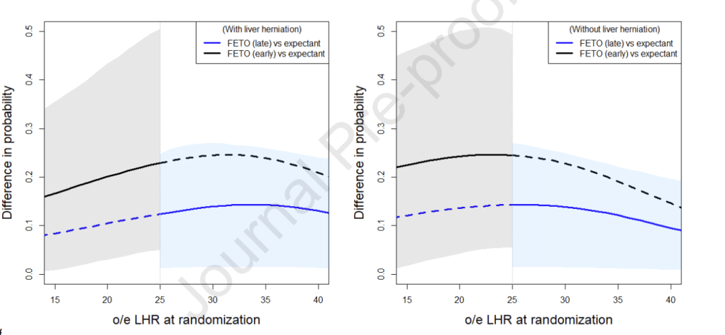 These 2 figures show the survival advantage of having FETO as compared to usual treatment based on the O:E LHR, even with the lowest risk babies in the trial, FETO is advantageous, as shown by the blue line and the blue shaded area representing the confidence limits of the benefit. The dotted lines are what the predicted survival benefits would have been if the babies had FETO at different GA, not allowed by the protocol, suggesting an even greater survival benefit for the moderate babies if they had FETO earlier.