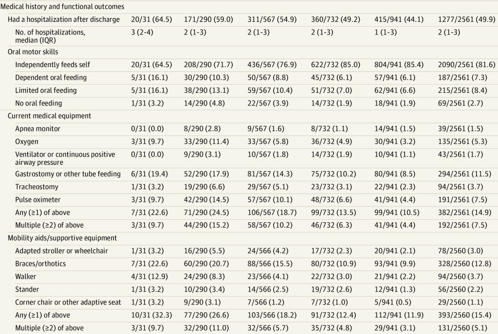 Hospitalisations, feeding competence, and medical equipment at home are all things that have a big impact on families, but are usually not reported. Most babies at all GA had some oral feeding at follow-up, but the most immature babies are much more likely to have limitations in feeding skills. Additionally mobility aids are more frequently required, which goes along with more frequently having a GMFCS indicating significant CP, and more frequently having BSID motor scores below thresholds. As for re-hospitalisation, more than 50% of them were for respiratory indications (data in the supplement) followed by surgeries, other infections, and then a variety of other indications, including 5% for growth and nutritional issues.
