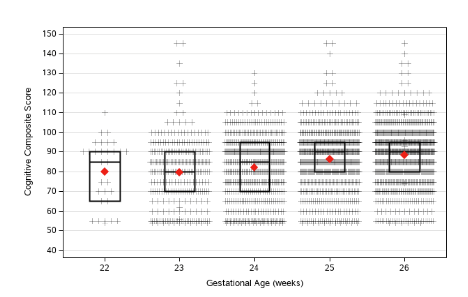 Thankfully, this publication has a much more detailed description of outcomes of the babies between 22 and 26 weeks gestation, which is much more useful than just categorizing them into one of 3 arbitrary groups. In the supplement are these very informative figures for each of the BSID scores: