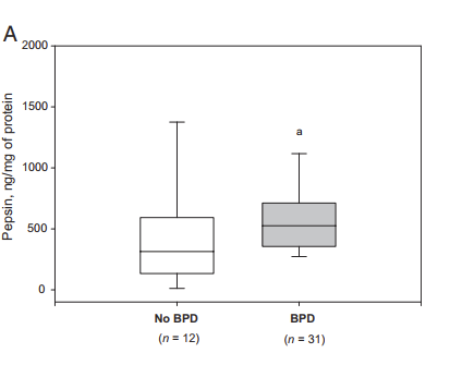Does GOR contribute to the development of BPD? There is so little reliable data to answer this question that I can only offer the old Scottish verdict of “not proven”. It is a possibility that GOR and aspiration of refluxed intestinal contents could contribute to lung inflammation and damage. I don’t think it would be too difficult to prove, actually, intubated infants could have recurrent endotracheal aspirates examined for pepsin (which should ordinarily not be in the lungs) and a correlation between evidence of aspiration and the development of lung injury. As far as I know, this has only been done once, (Farhath S, et al. Pepsin, a Marker of Gastric Contents, Is Increased in Tracheal Aspirates From Preterm Infants Who Develop Bronchopulmonary Dysplasia. Pediatrics. 2008;121(2):e253-9) with a rather unconvincing increase in pepsin concentrations among infants who developed BPD compared to those without BPD. You can see the figure below, and although the difference is “statistically significant” it doesn’t look very useful with a major overlap between cases and controls. Of note, 92% of their samples (and all of the babies at least once) were positive for pepsin, suggesting that micro-aspiration is universal, the results suggest that perhaps that having a bit more pepsin in the lungs increases lung injury (at least using oxygen at 36 weeks as the indicator of lung injury).