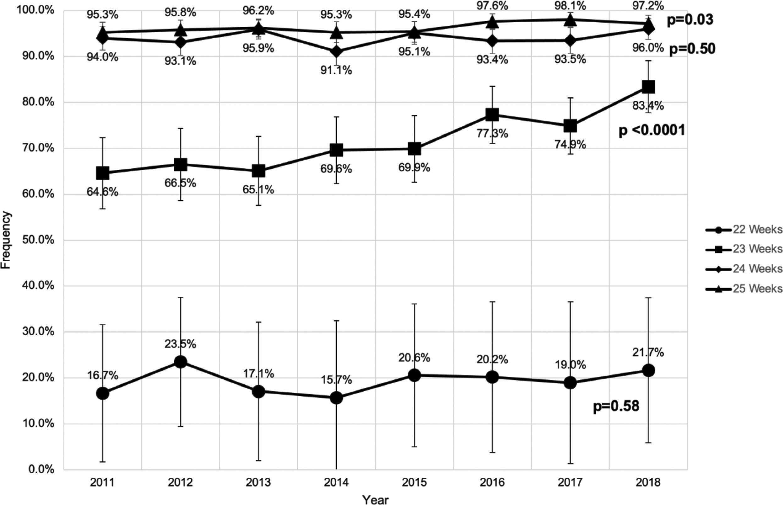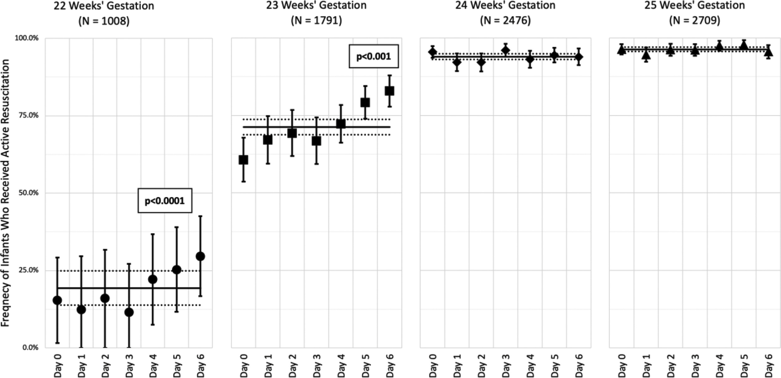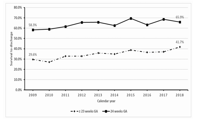 The California Perinatal Quality Care Collaborative reports the proportion of “active treatment of infants born at 22-25 weeks of gestation in California, 2011-2018” which also happens to be the title. (Chen X, et al. The Journal of Pediatrics. 2022) it shows that during those years, the frequency of active treatment of babies thought to be 23 completed weeks of gestation increased, a lot.