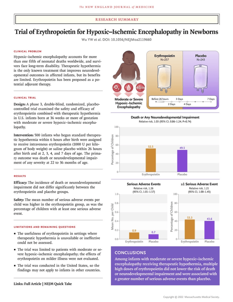 The latest trial to fail to find a benefit of erythropoietin (Epo) for neonatal brain protection has just been published (Wu YW, et al. Trial of Erythropoietin for Hypoxic-Ischemic Encephalopathy in Newborns. N Engl J Med. 2022;387(2):148-59). The HEAL trial, a multicentre randomized controlled trial in 500 asphyxiated term infants undergoing cooling found a similar incidence of death, of neurologic impairment, and of developmental delay at 2 to 3 years with Epo or placebo. There was also no difference in MRI injury, either as a percentage or when looking at the patterns of injury, or in discharge neurological examination.